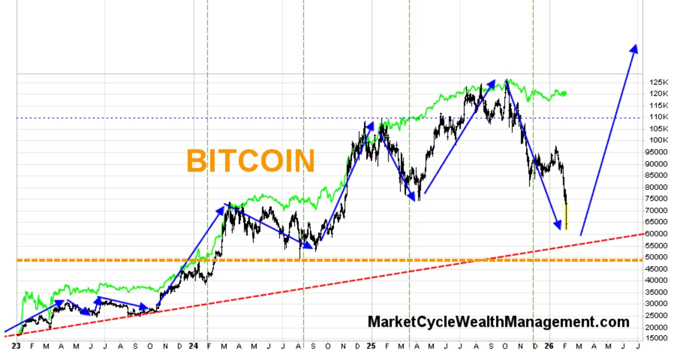 Gold and crypto have been moving higher as protection against weakening global currencies, it’s not just the USDollar that I worry about, although the USD has now broken below a 12-year support line (see far right green bar that is now below its blue bullish support line). Likely worst case scenario? I would expect the USDollar to very slowly gyrate up and down within the new dashed orange walls of the below sideways trend channel for the next few years. It is possible that the coming new Federal Reserve Chairman (Warsh) may be more hawkish than expected and this would help prop up the USDollar.