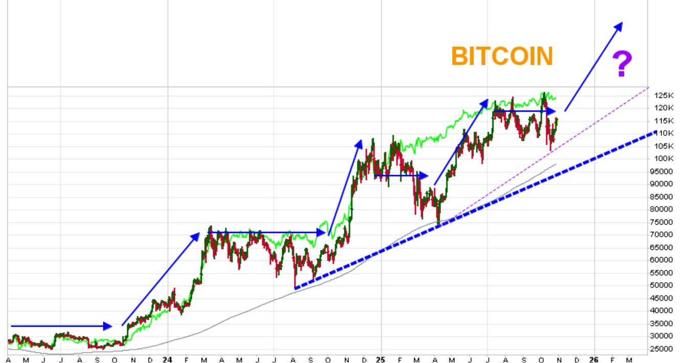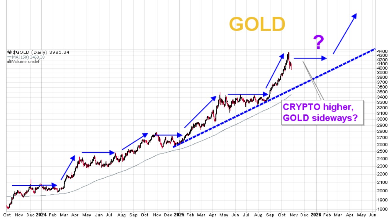 After a bit more near-term turmoil, bitcoin may soon head higher again, perhaps to $150,000(??). MarketCycle’s client accounts hold twice as much gold as we do crypto and this is because crypto is twice as volatile as is gold.