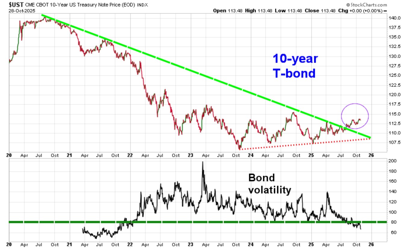 Bonds have also recently shattered through their 6-year long bear market trendline and bond volatility is finally back in the low-risk area. This allows us to add bonds back into portfolios, with high-quality corporate bonds being (unusually) less risky than are government bonds. Again, see the purple circle: