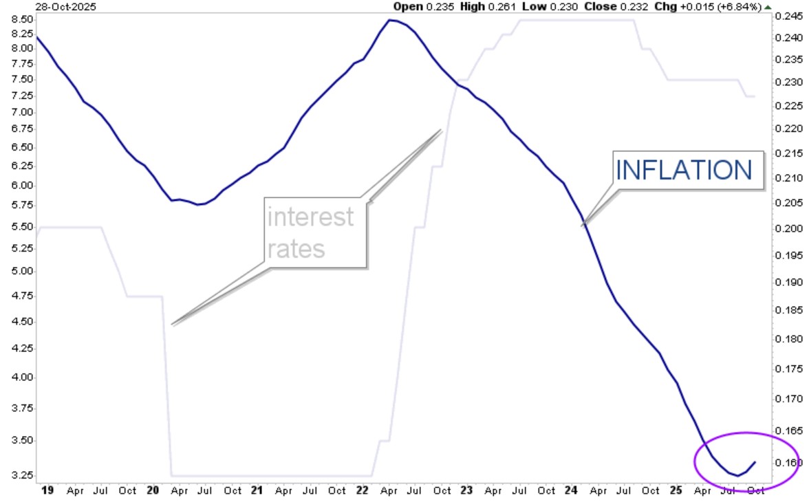 Gray line = Fed… blue line = inflation… they should almost be running in sync, and they are not because the Fed is always late to respond. The purple circle shows the recent turn-up in inflation. This means that the Fed should actually stop lowering rates unless the jobs numbers worsen… but they won’t ask for my opinion.