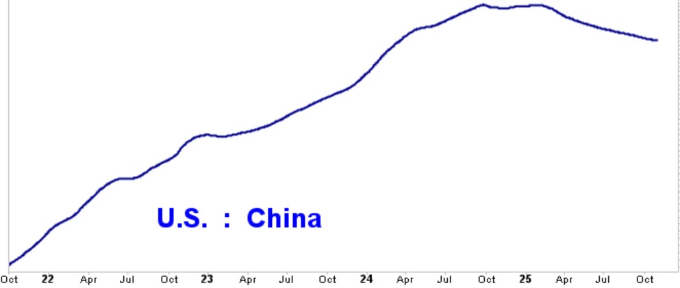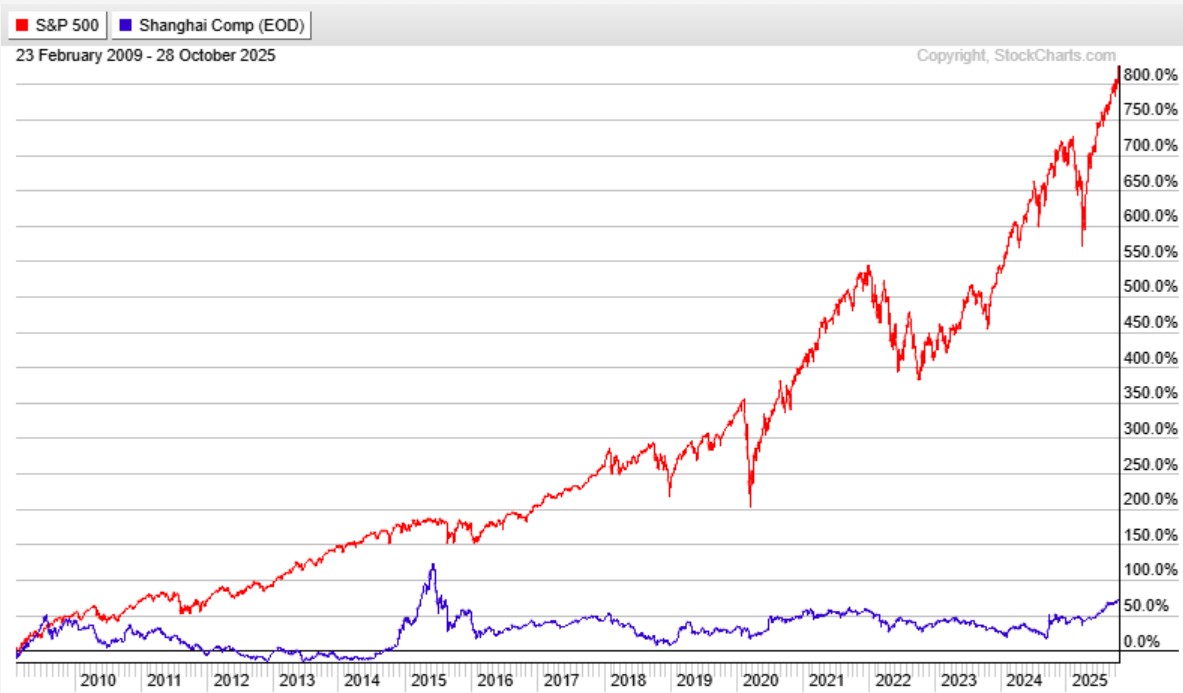 I’ve been watching a particular chart of the Chinese stock market, shown below, for the past 10 years. I created the chart in 2015 and drew the suspected trendlines out into the future. On October 27, 2025, China FINALLY shattered through its extreme long-term bear market trendline (see the purple circle below, middle-right) and the breakout has held. Chinese stocks are extremely undervalued considering the extreme size of its economy and the giant monetary stimulus that they are planning to release, plus the most recent Trump-Xi trade negotiations are behind us for the next 6 months (next planned meeting is in April of 2026).