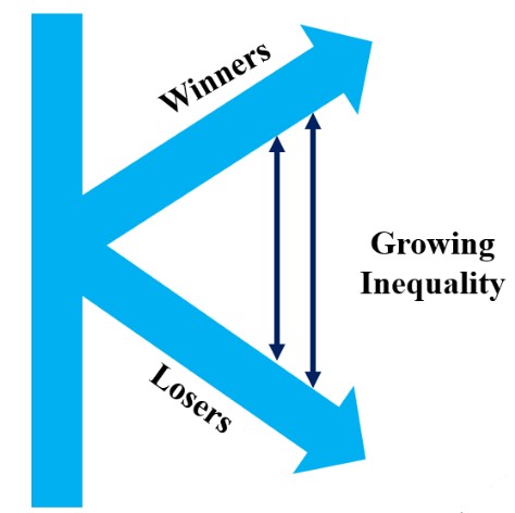 We have gradually moved into a “K” shaped economy. This has already happened and I see no easy fix, although the problem will eventually create its own cure. The top 20% of Americans, those that have high paying jobs OR those who maintain a continually funded INVESTMENT ACCOUNT will get richer. The middle class is getting squeezed to death and the poor are becoming even poorer.