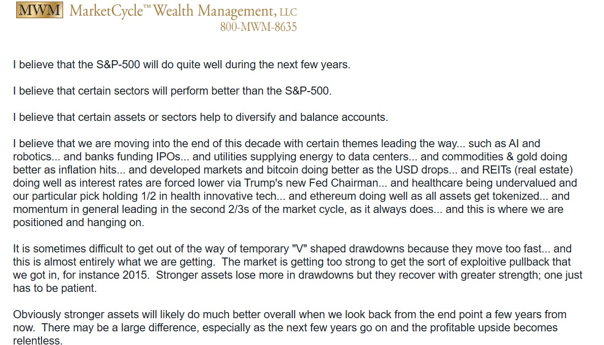 In late-October, MarketCycle saw risk levels increasing; the market fell in November. Then we saw risk abating and the market rose in the first half of December; it rose because of the super-strong seasonals of the normal “Santa Clause Rally.” We are watching risk levels closely as we enter 2026 because the improvement in indicators was less than was the December price gain. Our risk indicators are not based on emotions or “feelings,” they are mathematically calculated and based on certain conditions that occur before every single bigger market drop, and this requires decades of experience. Since most corrections going forward (for the next few years) will be very temporary and “V” shaped, we will have a higher threshold before we put any hedge on accounts.